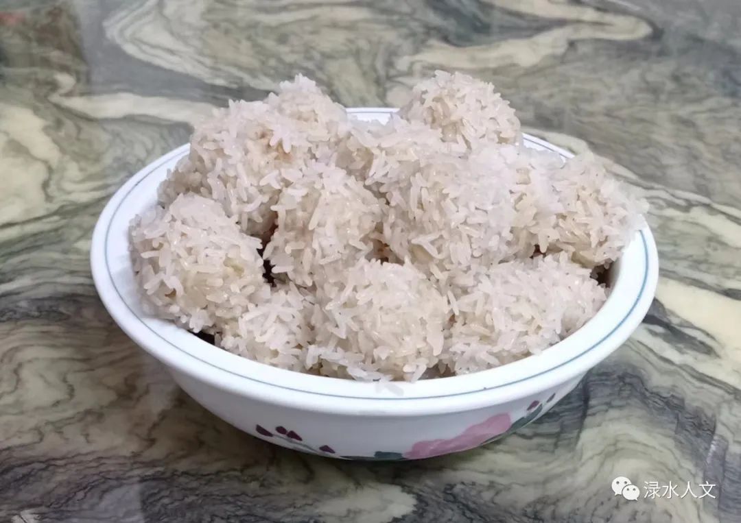 醴陵雪花丸好吃,当然是制作得精当。妻子多年操作下来,对此很有讲究与心得:糯米要上等好白糯米,洁白无杂色。先用水浸泡,夏日半天,冬日一整天(也可用温水浸泡缩短时间)。泡好的糯米要沥干水,与猪肉的比例是一比一,而猪肉的肥瘦比例是3:7(也可肥瘦自定)。这时,把肥肉去皮,瘦肉去除筋膜,混合剁或铰成肉泥。原料甫成,将糯米倒入肉盆中,放盐后也可以加一丝味精,但切不可加生抽酱油。然后用手混合均匀,搅和上劲,搓捏成一个个乒乓球大小的圆球,再放在已泡发的纯糯米中粘滚上一层米粒,上笼屉,水沸后蒸40分钟,一锅白灿灿的、混合着肉的荤香与米的清香的醴陵雪花丸就出笼了。