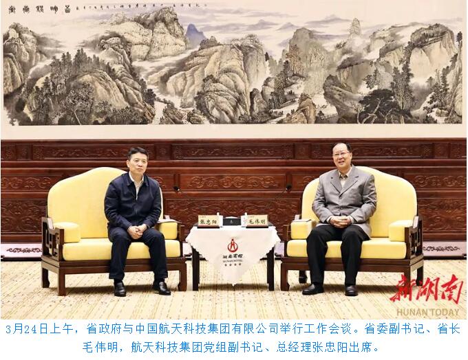 湖南之窗讯 3月24日上午,省政府与中国航天科技集团有限公司在长沙举行工作会谈,深入贯彻习近平总书记在湖南考察时的重要讲话和指示精神,围绕推进通航产业高质量发展等方面进行了深入交流。省委副书记、省长毛伟明,航天科技集团党组副书记、总经理张忠阳出席。