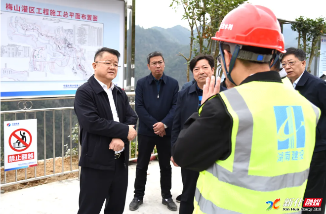在孟公镇梅山灌区工程一标施工现场,李铁雄听取相关部门单位关于工程建设的汇报。该标段骨干渠道总长26.74千米,新建骨干渠系包括总干渠渠首隧洞、太平龙溪分干渠,计划总工期1885天。李铁雄详细了解工程技术特点、施工进度等情况,就前阶段工程建设工作给予肯定。