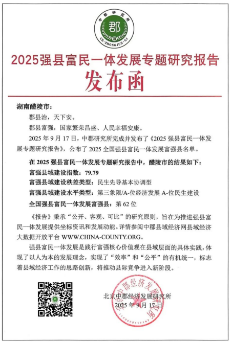 湖南之窗讯(供稿 丁祥军) 近日,国内权威县域经济研究机构北京中郡经济发展研究所发布了《2025强县富民一体发展专题研究报告》。在这份备受瞩目的榜单中,湖南省醴陵市成功入选“2025全国强县富民一体发展富强县”,在全国63个上榜县域中位列第62位,彰显了其在县域综合发展方面的显著成效。