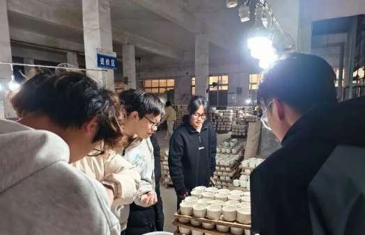 在湖南华日瓷业有限公司和醴陵和丰瓷业有限公司,项目组成员仔细观察陶瓷注浆、修坯、釉烧等环节,不时提问记录。座谈环节,大家围绕“釉料稳定性控制”“生产过程中视觉识别瓷器缺陷”等企业生产中的实际问题,结合专业所学,提出初步想法,现场思维碰撞不断。