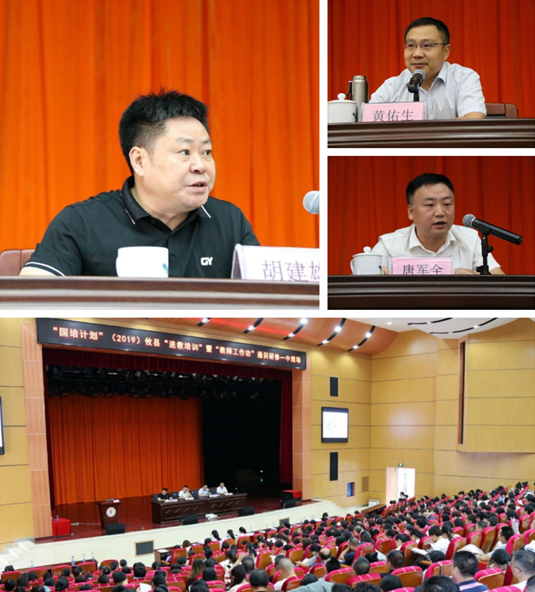 ▲副县长唐军全,政协副主席、教育局局长胡建雄,国培专家黄佑生作了重要讲话